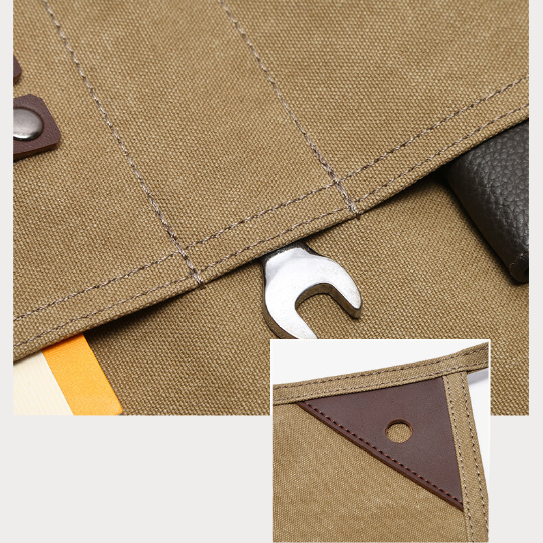 • DURABLE & CREATIVE: Handcrafted from water resistant & rugged 12 oz canvas. Reinforced with leather and rivets. Double-stitched tool pockets for strength and structure.