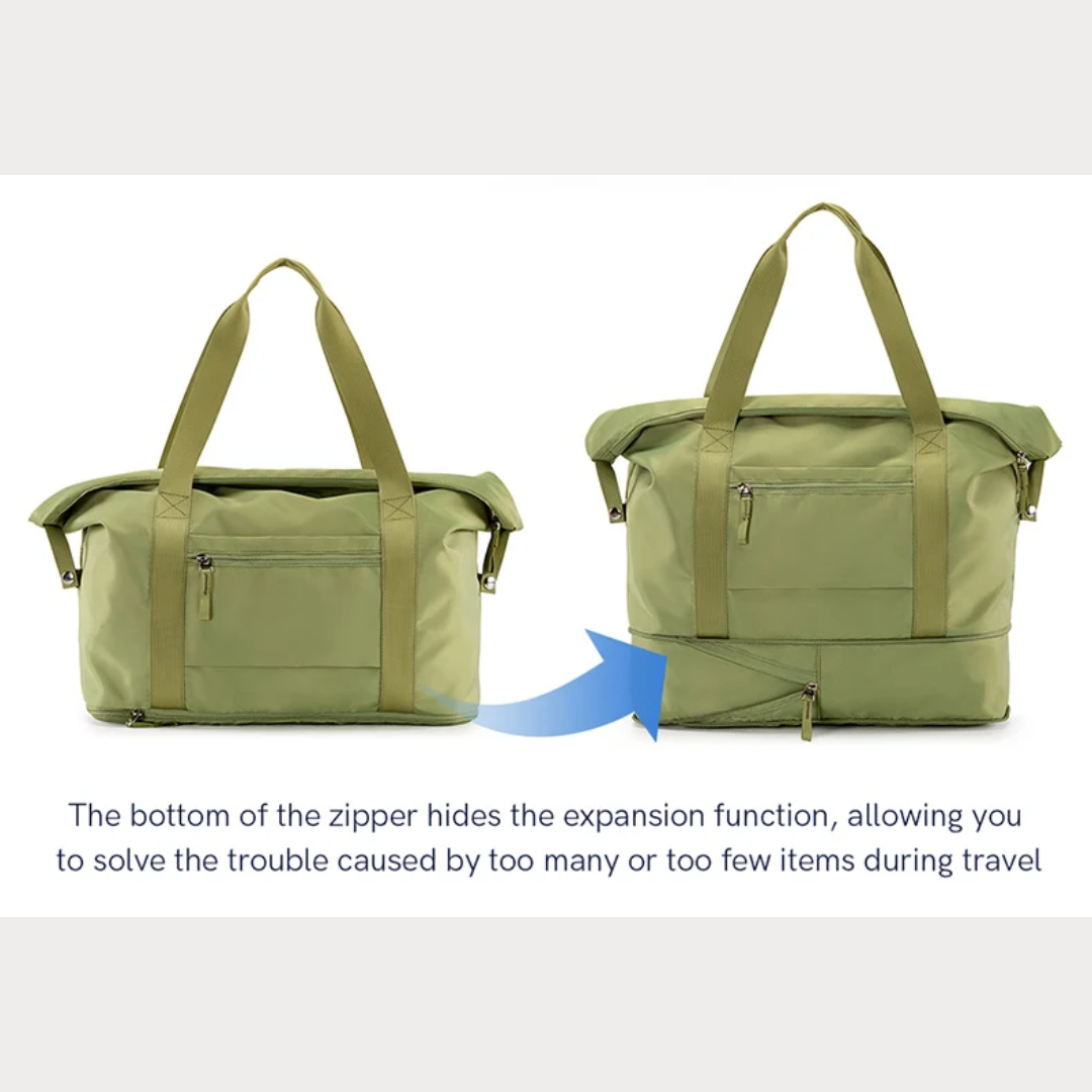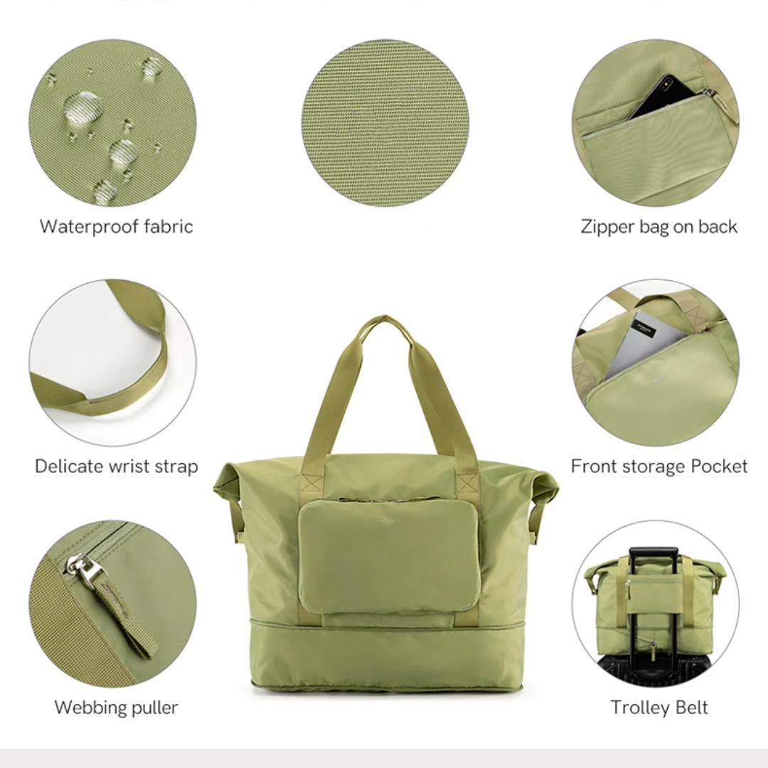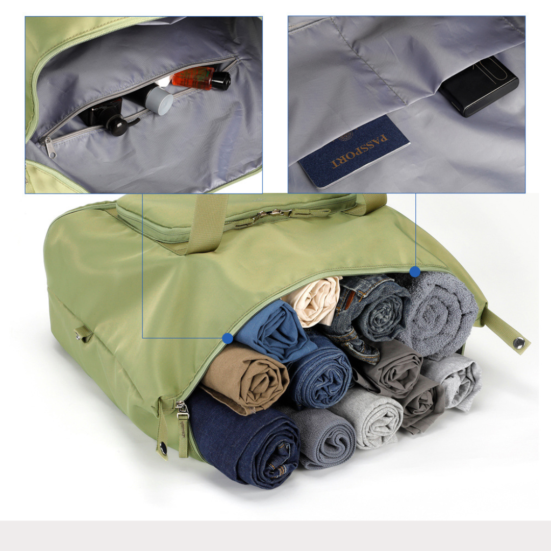 Large-capacity folding travel bag, the best companion in travel. You can carry it by hand or on the shoulder, or put it on the suitcase via the additional opening.