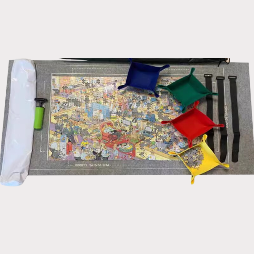 4*sorter trays, 1* felt mat, 1*inflatable tube, 1*pump, 3*magic straps, 1*storage bag. Four trays for easy organizing while you start a puzzle, prevent jigsaw puzzles from falling apart.