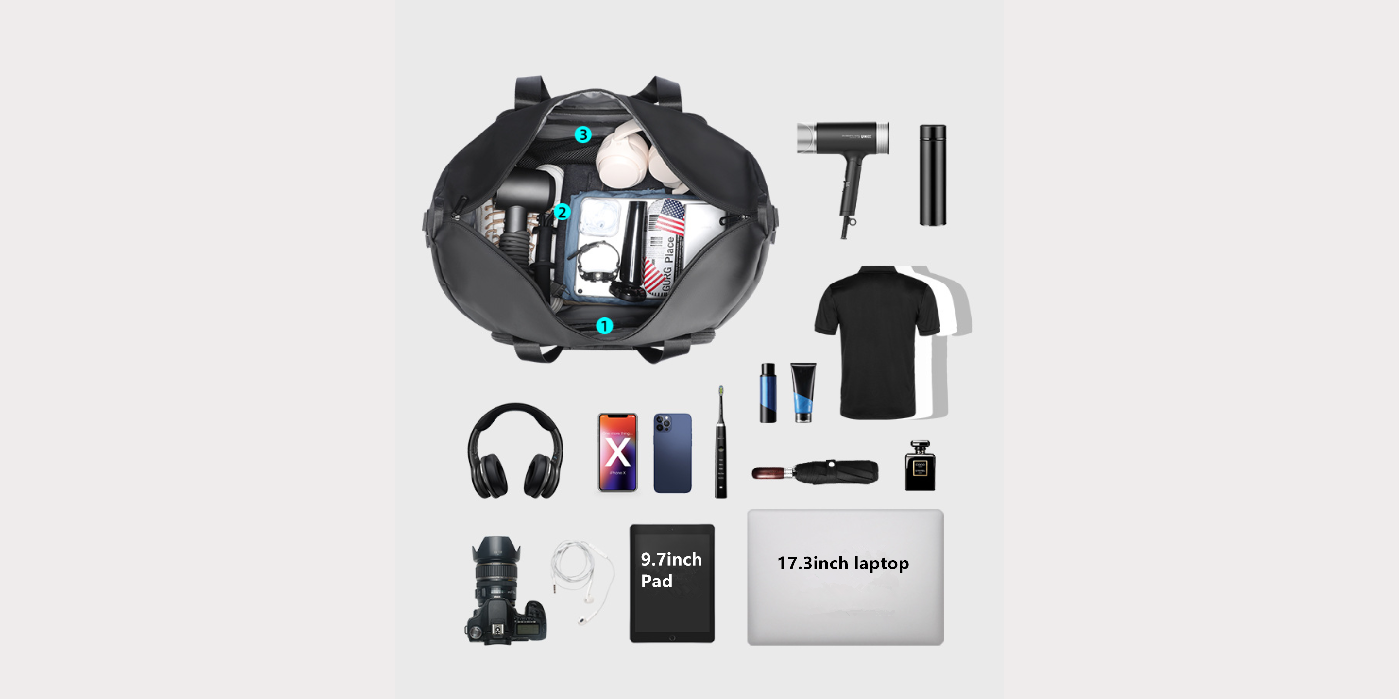 Designed with detachable and adjustable shoulder strap , it can be used as a holdall/shoulder bag/crossbody bag/sports bag/weekender bag/overnight bag.